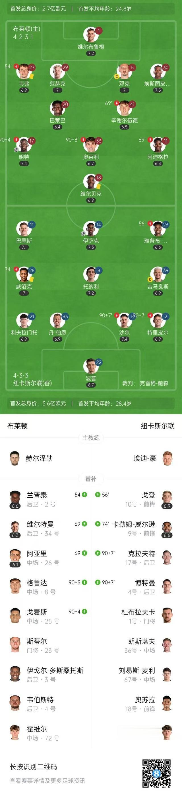 全场比赛结束,布莱顿1-1纽卡斯尔联。