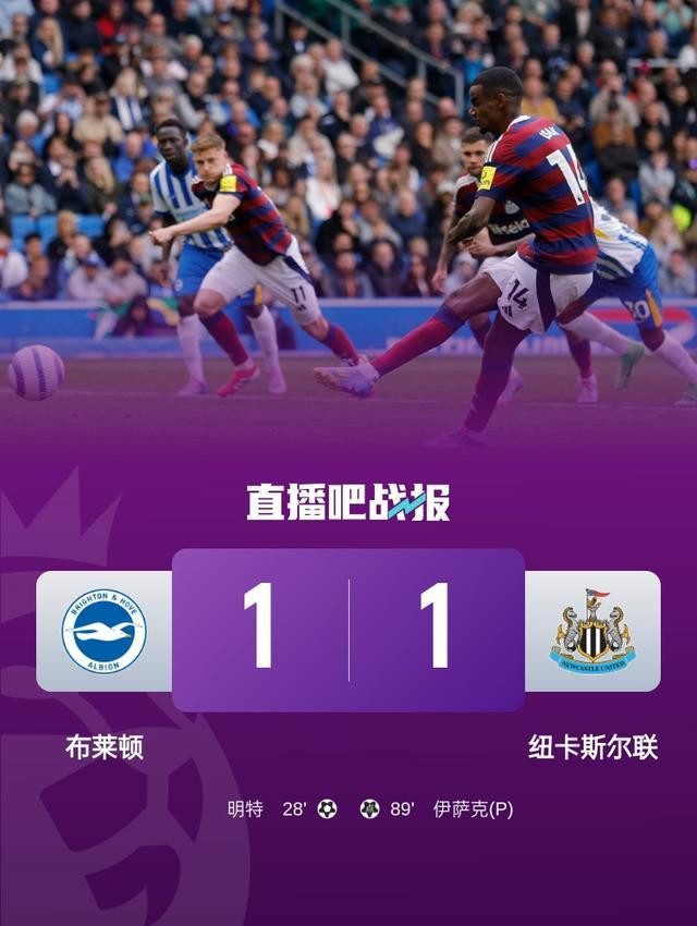 伊萨克主罚点球命中扳平比分,纽卡斯尔联1-1布莱顿。↓